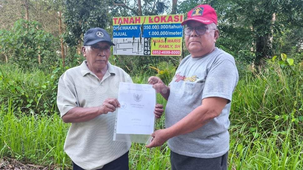 HM Arif AR (kiri) dan Aziz Akbar (kanan) saat memperlihatkan salah satu surat tanah yang dimiliki warga. [SuaraKaltim.id/Yuliharto Simon]